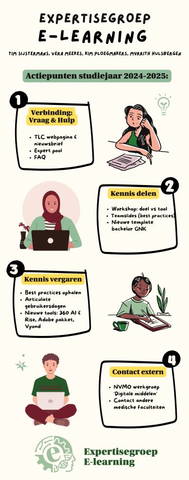 De Expertisegroep E-learning is een groep mensen die zich bezighouden met het vergaren en delen van kennis over e-learnings in het onderwijs. Deze expertisegroep bestaat uit Myrrith Hulsbergen (voorzitter), Vera Meekes (secretaris), Kim Ploegmakers en Tim Sijstermans.