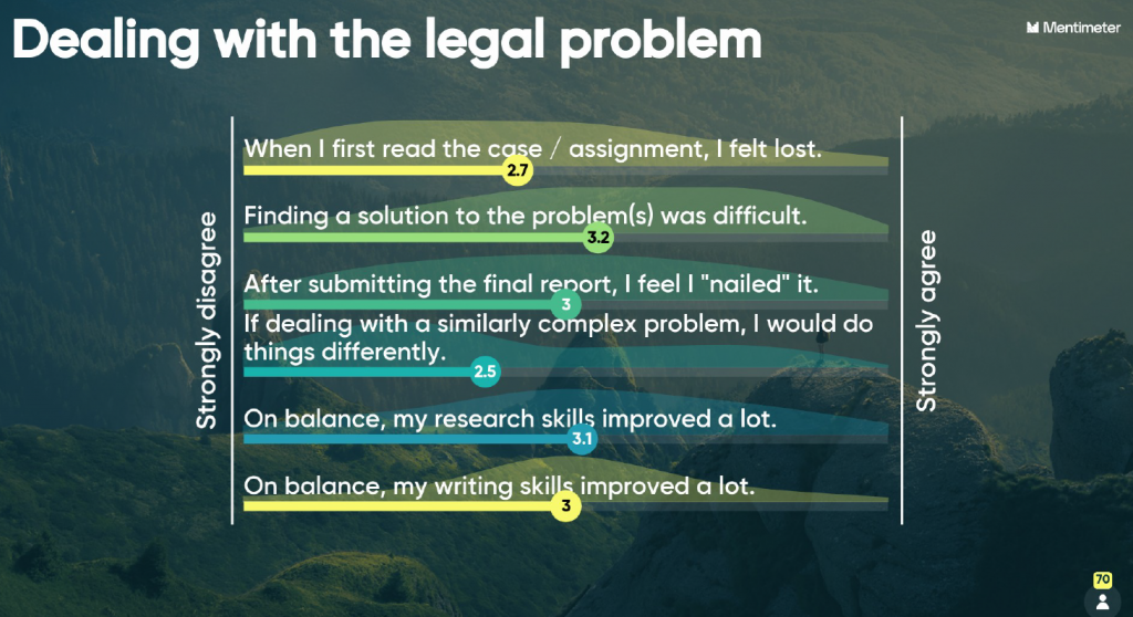 Student gaven aan een positieve ervaing te hebben gehad met groepswerk. Een ander element dat succesvol is gebleken is dat de studenten gastcolleges kregen van juristen uit de praktijk. Studenten kregen daarnaast de gelegenheid om in brainstormsessies met hen te sparren. Zo ging de casus nog meer leven en kregen de studenten het gevoel dat zij bezig waren met een reëel maatschappelijk probleem uit de praktijk.