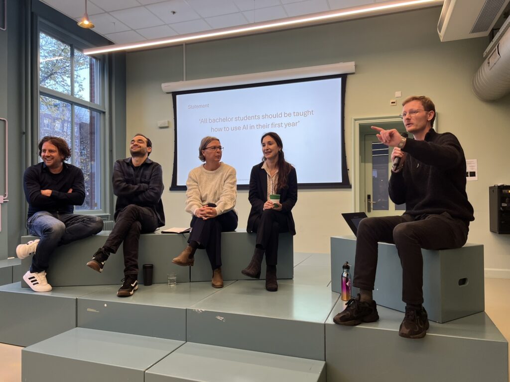 Na de pauze was er een paneldiscussie met vooraanstaande experts, die de ontwikkelingen van AI en de verschillende perspectieven die zij hebben op het gebruik van AI in het onderwijs bespraken n.a.v. verschillende stellingen. De discussie werd geleid door Ivar Kolvoort (Adviseur AI in Education, TLC Central), het panel bestond uit Dora Achourioti (voorzitter van de AUC Taskforce Generative AI in Education), Rik Jager (Product eigenaar Digital Collaboration) en Jolanda Broex (Onderwijsadviseur) Zij bogen zich over de volgende stellingen: 1. Alle bachelor studenten moeten in hun eerste jaar leren hoe ze AI moeten gebruiken. 2. De rol van docenten zal drastisch veranderen door AI. 3. De UvA zou studenten actief gebruik moeten laten maken van commerciële AI-software (bijv. ChatGPT) zodat ze ervaring opdoen met de meest geavanceerde AI-technologie.