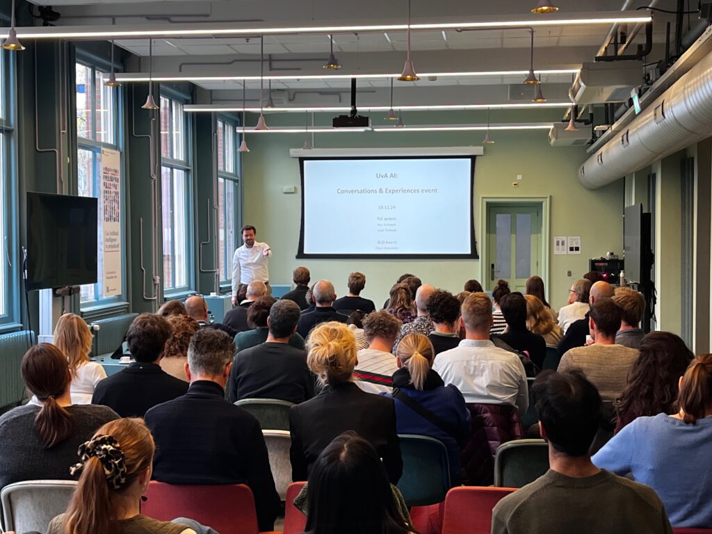 Op 19 november 2024 organiseerde TLC-Centraal samen met de DLO Board (Digitale Leeromgeving) in het Humanities Lab (Bushuis) het UvA AI evenement: Conversations & Experiences. Het was een geslaagde, druk bezochte middag waarin docenten hun ervaringen deelden over pilots rondom AI gebruik. Ook was er ruimte voor het publiek – wat bestond uit docenten, ICT medewerkers, software developers en belangstellenden – om over vraagstukken mee te discussiëren en vragen te stellen aan een expert panel experts.