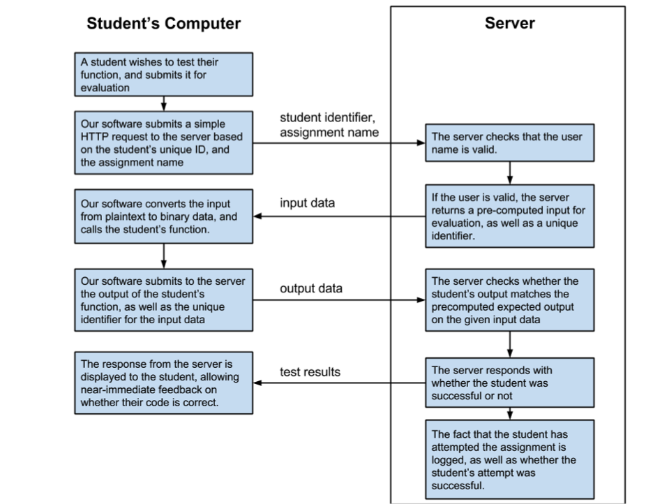 bijdrage van:  Thomas Mensink Next week our course ‘Visual Search Engines’ will start. Roughly 50 students from the MSc Information Studies program have enrolled, and we’re excited to start using our automatic online evaluation server for the python lab assignments. The aim of the lab is to support the understanding of the theories discussed during the lectures, but learning-to-program is not one of the class (key) objectives. The goal of online evaluation of the students’ code is to enable students to study on their own pace, by receiving immediate feedback about the correctness of their code and being able to track their own progress. This is inspired -in part- by the people behind the first MOOC initiatives, nicely illustrated by Salman Khan (founder of Khan Academy): When you learn to ride a bicycle, and you fail to learn to ride a bicycle, you don’t stop learning to ride the bicycle, give the person a D, and then move on to a unicycle. You keep training them as long as it takes. And then they can ride a bicycle. During the past weeks, we have been discussing the requirements, possible setups, and existing solutions for automatic evaluation of code. There are many online platforms, which focus either on learning-to-program, or collaboration on (python) programming. Most notable is CodeCademy (http://www.codecademy.com), which allows the creation of new courses, and which has a ‘pupil-tracking’ module to track progress of students. Unfortunately, those two cannot yet be combined; although this is planned for the (near) future. Therefore we have designed our own evaluation protocol for students’ code. This required some serious consideration. Evaluating honest attempts of the lab assignment is rather trivial, however how to prevent malicious code to be run on the evaluation server? Restricting a general programming language (such as Python) is hardly possible, without restricting so much that the program is not of any use anymore. We came up with the following design: Instead of executing student code on the server, we sandbox the code to the student's computer. The students are evaluated on a series of pre-specified functions, the guts of which have been left for the students to fill in. In this way, we insure that we know exactly what form of data each function expects to receive and is expected to return. As we already know the function's expected behaviour, we are able to provide the function with input data to be fed through the function locally, on the student's machine. The output of this evaluation is then returned to the server, where it checks it against a pre-computed expected output, and returns whether the student was successful or not. This allows to unit-test most of the required functions, although this might not be suited for all kinds of programming exercises. The final lab evaluation will be based on a lab-report and the submitted code. The server logs the attempt by the student, and its success, so that both the course administrators as well as the student are able to track the student's progress through a web interface. For the hosting of the server software, we use a service called PythonAnywhere (http://pythonanywhere.com) that allows users to easily create web applications using a full python installation. The python backbone of the service allows administrators to easily add pre-computed test inputs and outputs by simply implementing gold-standard versions of the functions the students are expected to complete. A diagram giving an overview of the communication between a student's computer and the server in the use case of a student submitting a function for review is provided below. diagram In the next blog, we will discuss our in-class experience! Spencer and Thomas