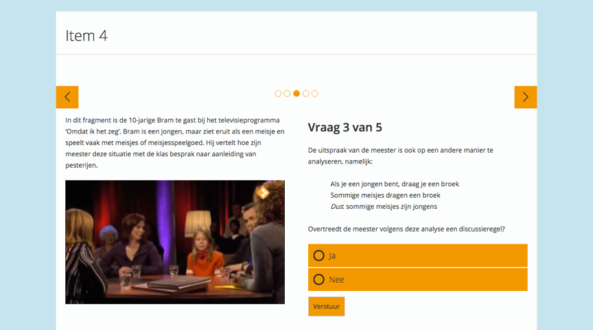 Stappen Gedurende studiejaar 2014-2015, blok 2, semester 2 hebben studenten van het vak Argumentative practices 2 het digitale oefenmateriaal ontwikkeld. (1) Ontwikkelfase Na een startbijeenkomst met een PP presentatie van de opdrachtgevers (José Plug en Jean Wagemans) hebben de studenten in groepjes onder begeleiding van de vakdocent (Ingeborg van der Geest) een eerste versie van de oefenmodule ontworpen. Deze module is vervolgens -  na instructie over de eigenschappen van het gekozen format – in Adapt Learning geplaatst door de externe begeleider ICT van deze Grassrootsprojecten (Myrthe Bil). (2) Testfase De Adapt Learning modules zijn getest door een team van docenten op bruikbaarheid en correctheid. In de beoordeling zijn zaken meegenomen als de kwaliteit van de vraagstelling en de antwoorden, het niveau, en de consistentie van de layout. (3) Gebruiksfase De modules worden op dit moment aangeboden aan studenten van het BA vak Argumentatie-analyse onder begeleiding van docent Eugen Popa en het MA vak Argumentation and Discourse in Science onder begeleiding van docent Jean Wagemans. Door studenten van beide groepen zullen evaluatieformulieren worden ingevuld die in het vervolgtraject van deze projecten gebruikt zullen worden om het materiaal in de nu uitgevoerde pilot door te ontwikkelen tot een volwaardige digitale oefenmodule. Resultaat Het voorlopige resultaat van deze gekoppelde Grassrootsprojecten is een NL en EN digitale oefenmodule Argumentatie-analyse die is onderverdeeld in vier thema’s die behandeld worden bij de colleges. Elk thema heeft een aantal items, bestaande uit een tekstfragment of een videofragment, waarover een aantal vragen worden gesteld. De feedback aan de student is of het antwoord goed of fout is.item4       Reacties De MA studenten die de module hebben ontwikkeld hebben reflectiedocumenten geschreven waarin zij hun ervaringen hebben weergegeven. Een aantal voorbeelden hieruit: