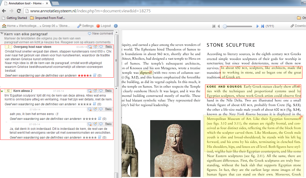 Via het Annotatiesysteem analyseerden zij per groep bijvoorbeeld een tekstdeel waarin ze gezamenlijk de belangrijkste passages moesten markeren en definities moesten geven van begrippen (bijvoorbeeld Kouros, fronton). Verder dienden ze middels het toekennen van sterren ook een waardering voor elkaars opmerkingen en definities te geven. Uit de evaluatie van Inleiding in de kunstgeschiedenis I – ingevuld door 85 studenten – blijkt dat studenten de opdracht met een 3.4 (uit 5) waardeerden als het ging om het leren begrijpen van de stof. Een student schrijft: “opdrachten waren leuk om mee bezig te zijn, leerzaam in ieder geval.” Het nut van de opdracht werd met een 3.48 gewaardeerd en de moeilijkheid met een 2.95. Een medestudent zegt: “De annotatietool vind ik super handig.” Studenten leerden op een efficiënte manier de kernpassages uit de stof te halen. Kritisch en efficiënt lezen kunnen ze tijdens hun verdere studie goed toepassen.