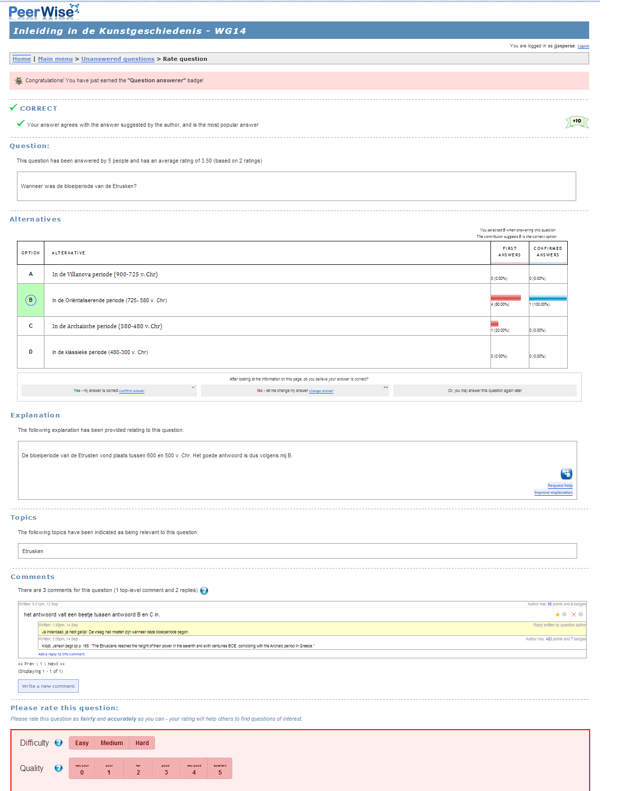 PeerwiseMet behulp van Peerwise maakten de studenten met hun groep meerkeuzevragen die zij tevens van antwoorden en antwoordmodellen voorzagen. Het mooie is dat er niet alleen vragen over teksten gesteld kunnen worden, maar dat ook afbeeldingen kunnen worden toegevoegd. Het maken en beantwoorden van vragen had tot doel om studenten de stof kritisch te laten bestuderen. Uit de evaluatie van Inleiding in de kunstgeschiedenis blijkt dat studenten de opdracht met een 3.51 (uit 5) waardeerden als het ging om het leren begrijpen van de stof. Een student schrijft: “Peerwise vind ik echt geweldig, omdat je met het bedenken van vragen de stof wel goed moet bestuderen! Ik zou met alle liefde elke week Peerwise vragen maken en beantwoorden.” Het nut van de opdracht werd met een 3.67 gewaardeerd en de moeilijkheid met een 2.98. Studenten leerden met behulp van Peerwise als een ‘docent’ naar de stof te kijken: wat zijn belangrijke vragen en wat zijn goede vragen?