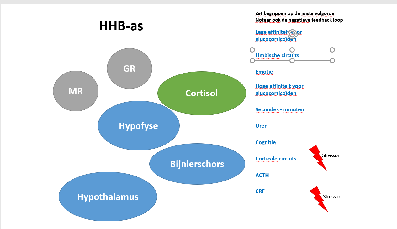 Students are put in break-out rooms, and all groups are assigned one slide of the same PowerPoint. On this slide they find different concepts, that they have to drag to the right place to create a concept map, in this case of the HPA-axis. This creates a visual map of the concepts and the relationships between them, that activates previous knowledge and stimulates interaction. Another benefit is that the teachers can base their explanation on the knowledge in the group and either explain a concept/relation better or go into depth.