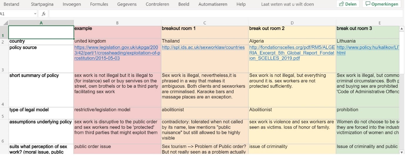 The last example is from one of our colleagues at the Faculty of Social and Behavioral Science. Hanne Stegeman teaches a course called Sexwork in its Local and Global Complexity. The goal of the exercise below was to have students gain knowledge on policies in different countries. There were several small groups of students in break-out rooms. All groups were working in the same file. This made it very simple to discuss the outcome of the different groups afterwards, and the teacher had a way of keeping track of what the groups were doing during the time they were in the break-out rooms.