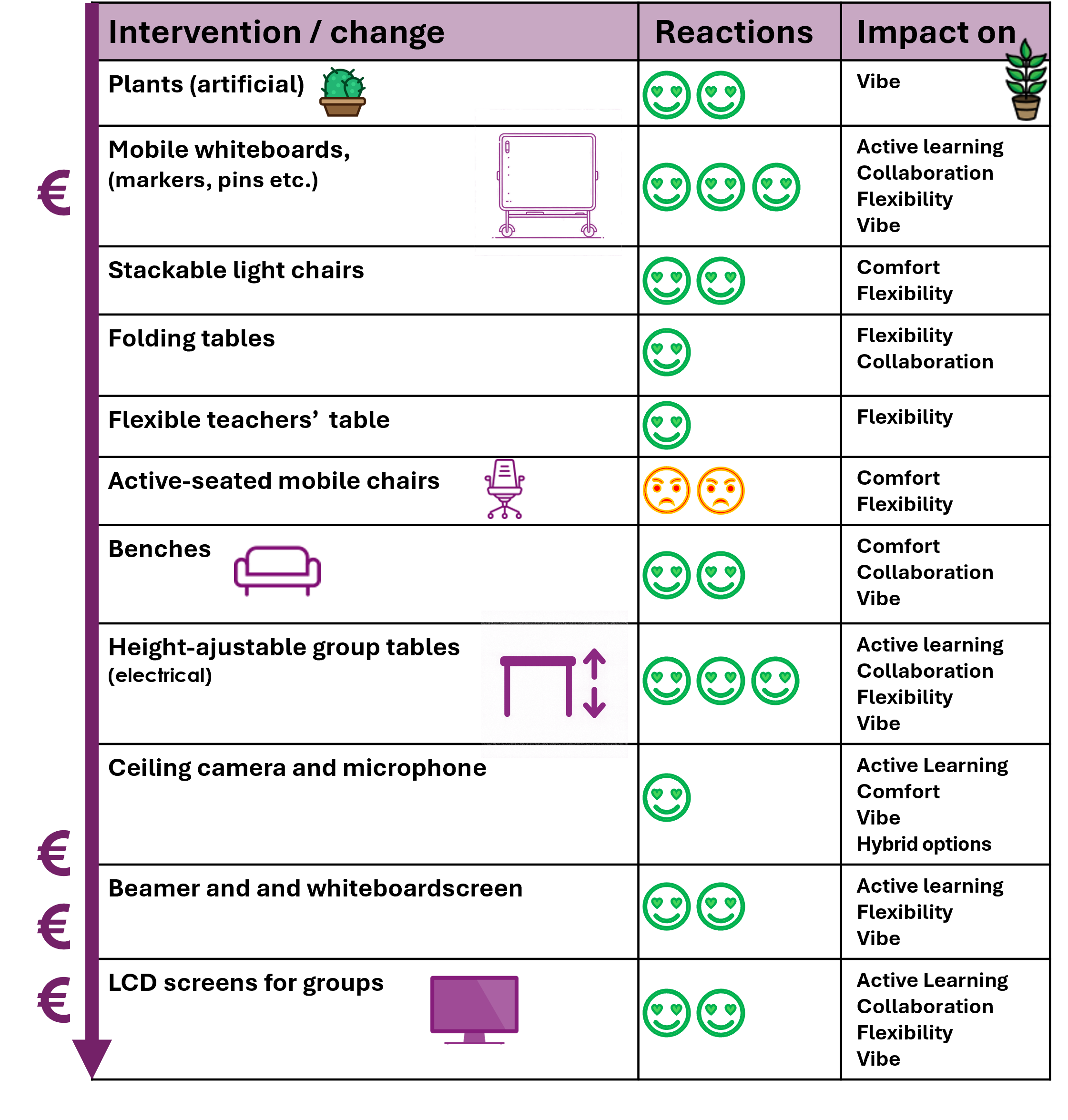 Interviews, observations, questionnaires and the smiley-machine revealed that students and teachers highly appreciate the rooms for tutorials and active learning activities. Over 80% of student-respondents preferred them over an old-fashioned classroom. The teachers who took part in the pilot study unanimously stated “we want more of these rooms!”