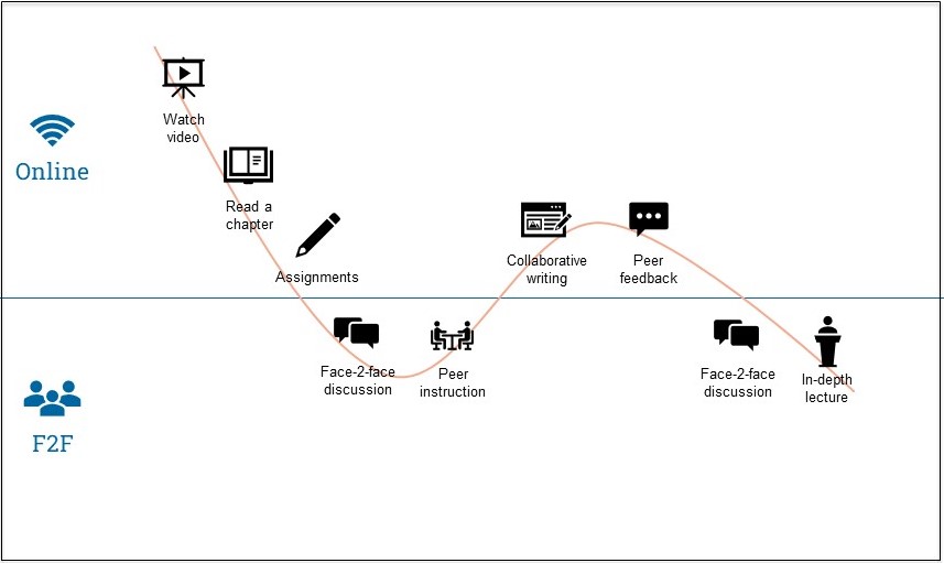 To design your ideal blend, you can use the blended learning wave (Dijkstra, 2022). This is a visualisation of the student’s learning journey during your course. It shows the sequence of all the activities your students have to go through and shows whether the activities take place online or in class.